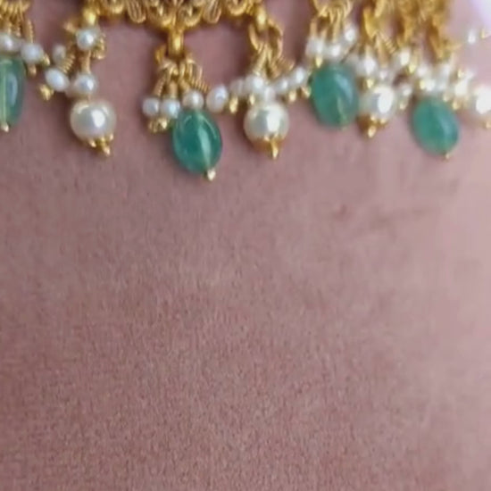 This stunning choker showcases the Goddess seated gracefully at its centre, symbolizing wealth, peace, and prosperity. The design is adorned with intricate carvings, emerald-green stones, and dainty pearl drops making it a timeless festive statement.